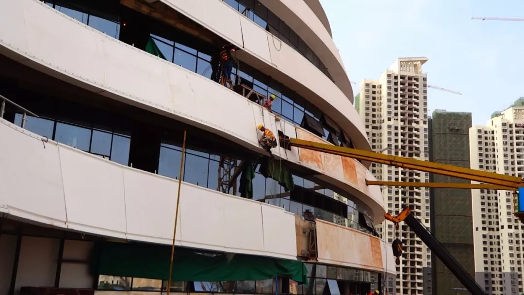 青龍公司作為國內(nèi)GRC領域的知名企業(yè),承接了新媒體中心三座主體結(jié)構(gòu)的雙曲面外墻板項目。由于所有的面板沒有一片完全相同,不僅要經(jīng)受高空風雨的侵蝕,相鄰兩塊更要緊密榫合,天衣無縫,并在整體上形成流線性美感,因此需要制作大量的模具,工程極為繁瑣。但青龍GRC團隊克服重重困難,從圖紙深化設計、彩色GRC選材、造型產(chǎn)品生產(chǎn)到安裝施工等一系列工序中都做到極致,讓甲方和監(jiān)理都非常滿意。