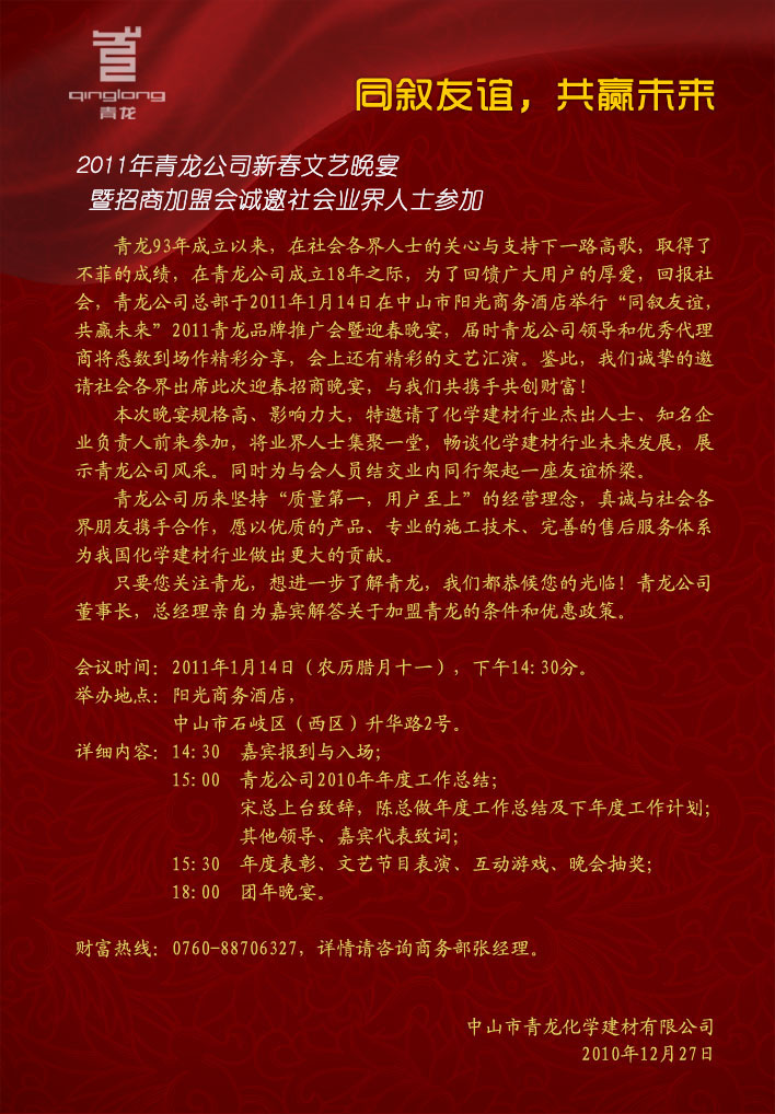2011年青龍公司新春文藝晚宴暨招商加盟會(huì)誠(chéng)邀社會(huì)業(yè)界人士參加