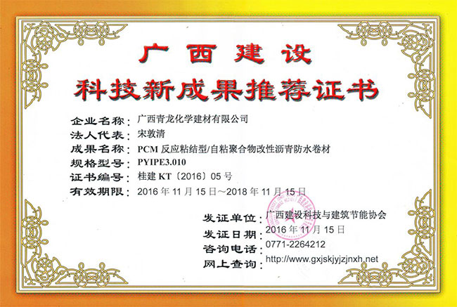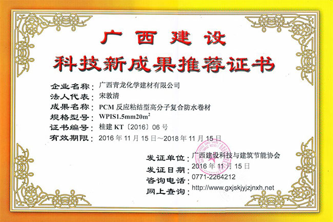 青龍建材兩款防水卷材獲廣西科技新成果推薦證書(shū)
