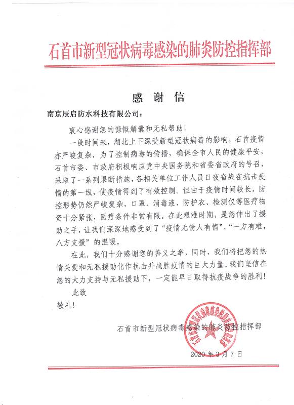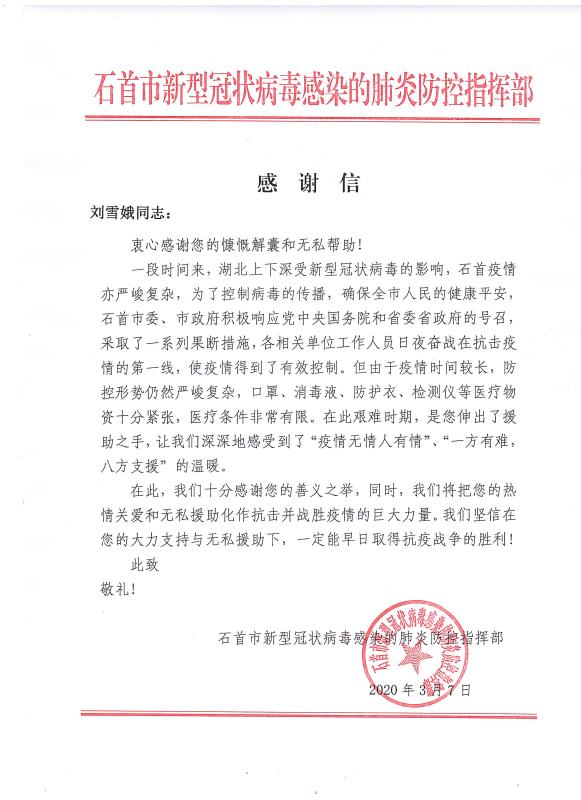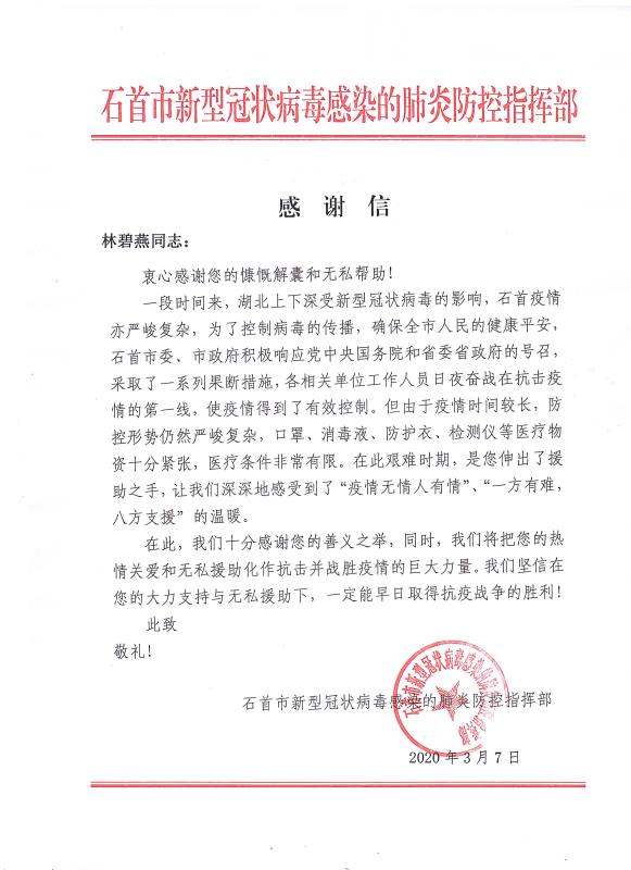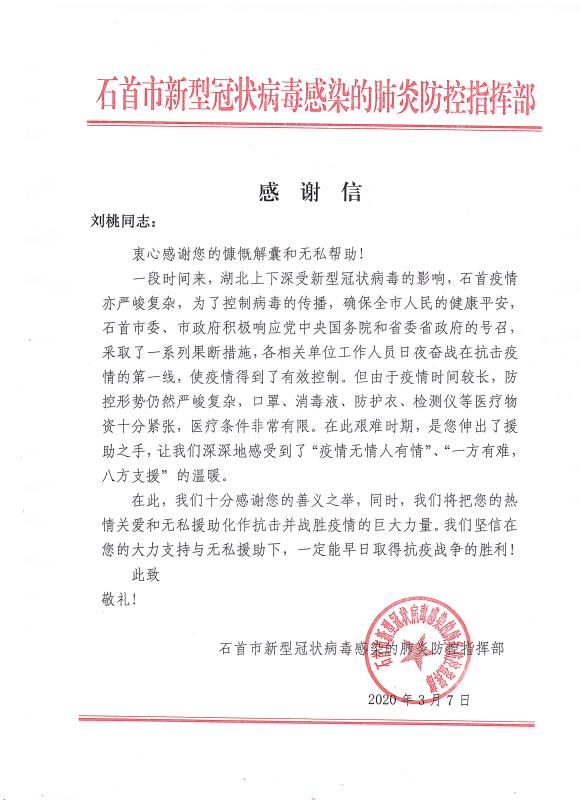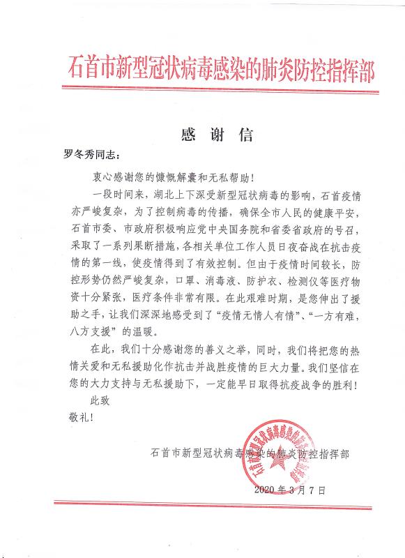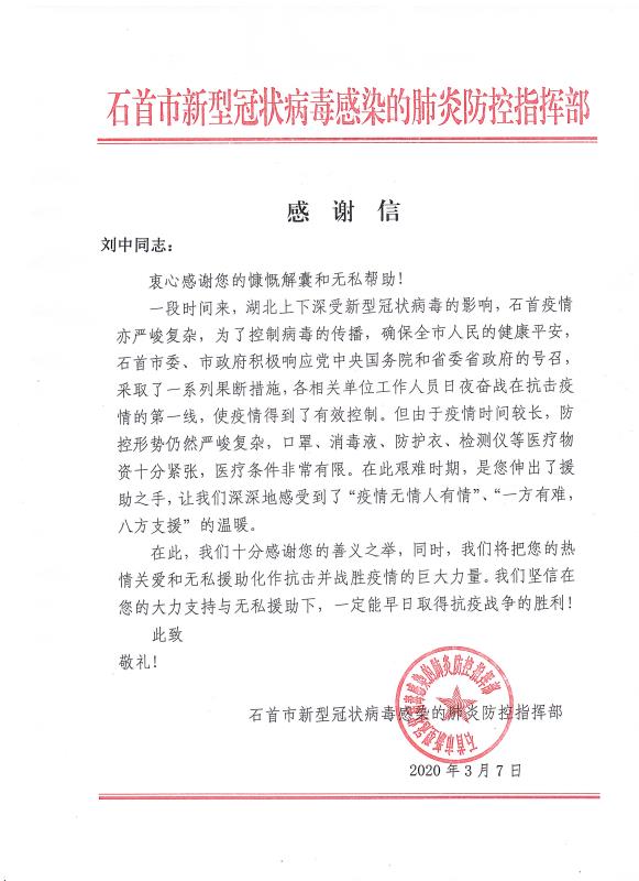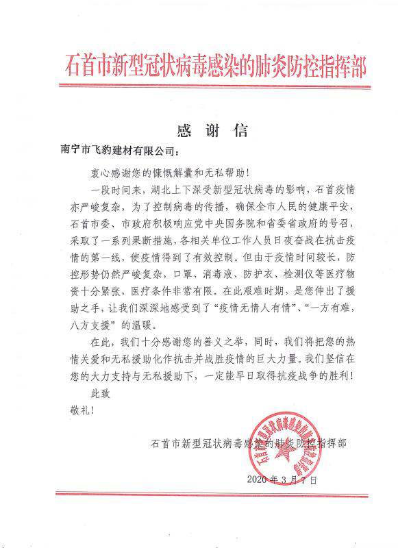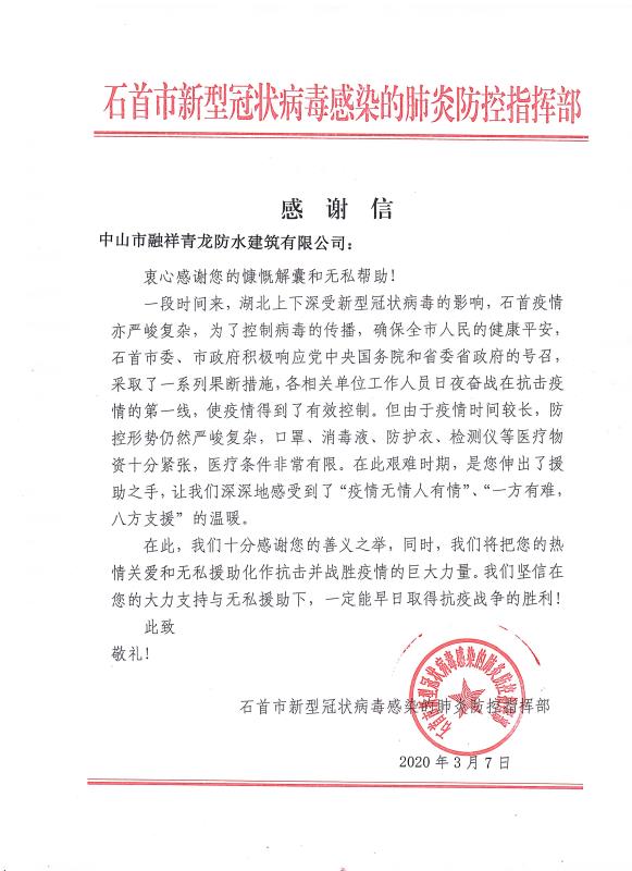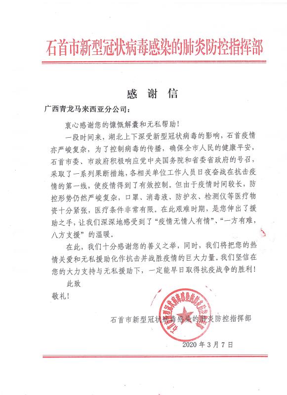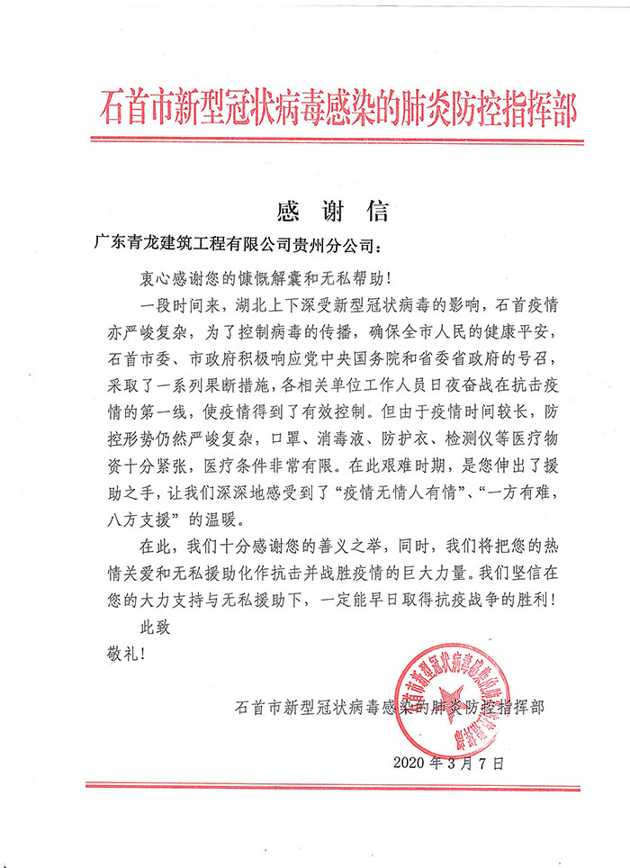 感謝信來(lái)自石首市新型冠狀病毒感染的肺炎防控指揮部,信中表示,對(duì)青龍公司及旗下代理商善義之舉表示了高度肯定和感謝,將把大家的"熱情關(guān)愛(ài)和無(wú)私援助化作抗擊并戰(zhàn)勝疫情的巨大力量,早日取得抗疫戰(zhàn)爭(zhēng)的勝利!"