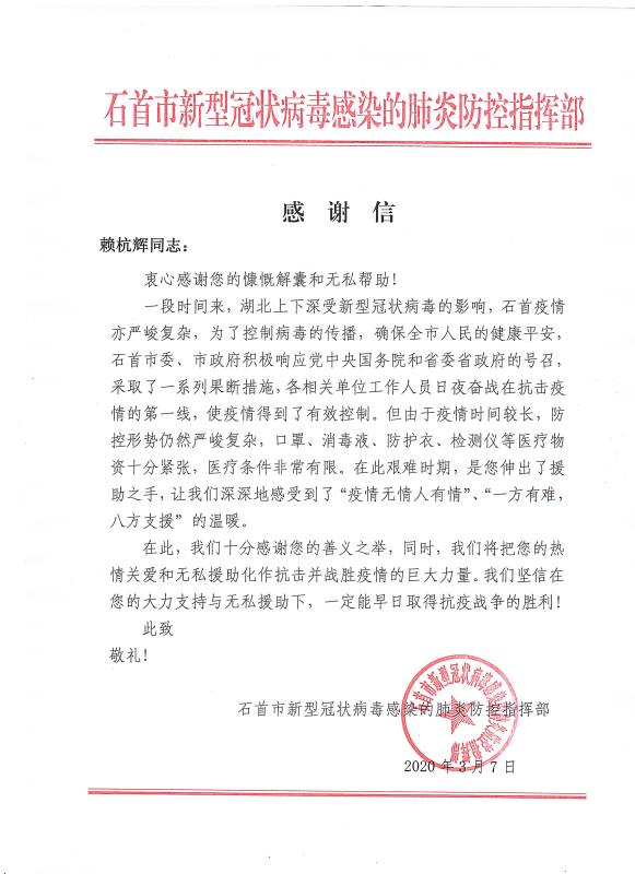 當(dāng)全國(guó)疫情數(shù)據(jù)持續(xù)向好,各地復(fù)工復(fù)產(chǎn)有序進(jìn)行的時(shí)候。青龍公司收到了來(lái)自湖北省石首市新型冠狀病毒感染的肺炎防控指揮部16封特殊的感謝信。