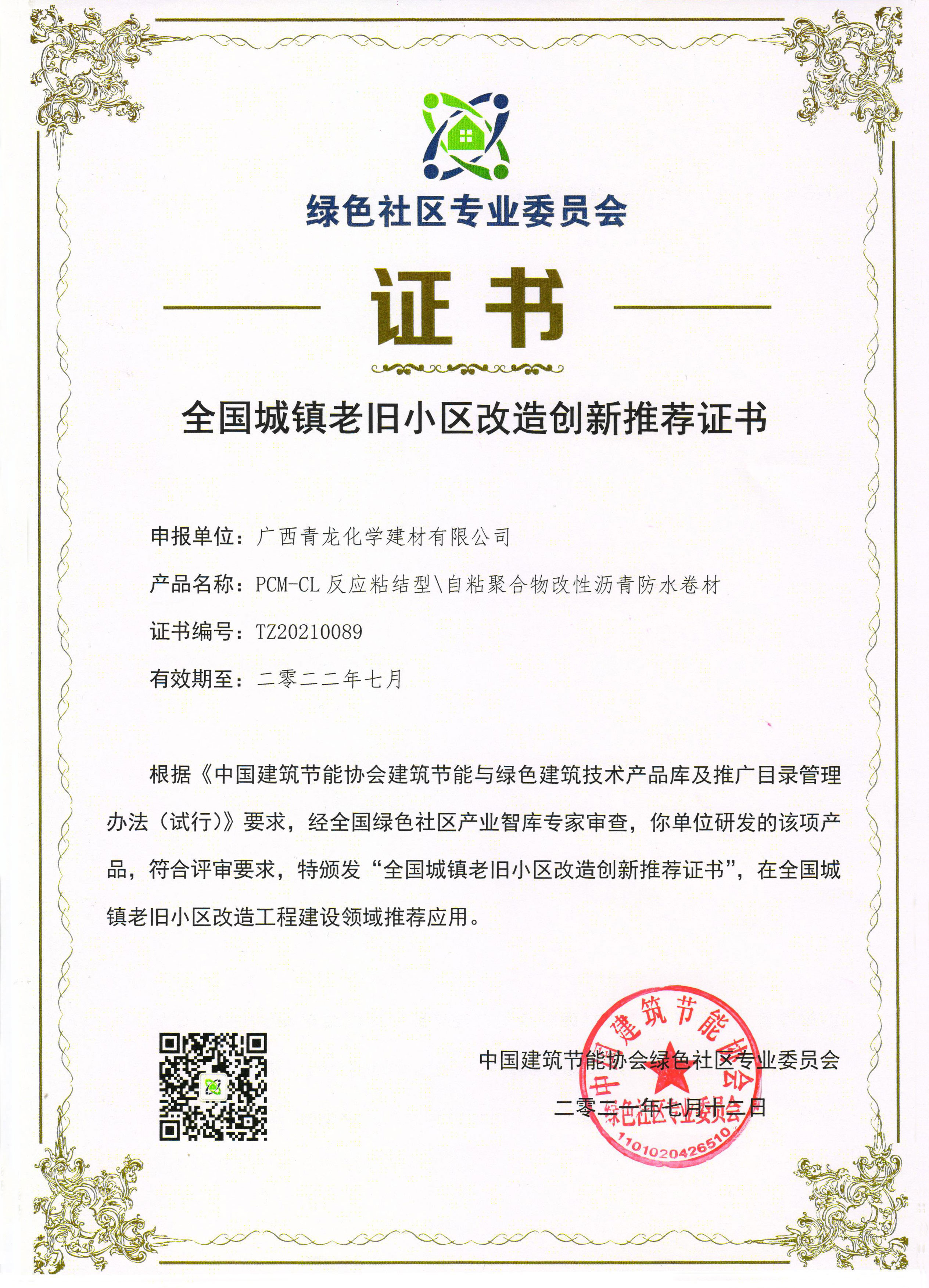 近日,由中國(guó)建筑節(jié)能協(xié)會(huì)綠色社區(qū)專業(yè)委員會(huì)主辦,全國(guó)城鎮(zhèn)老舊小區(qū)改造創(chuàng)新推薦產(chǎn)品、技術(shù)申報(bào)企業(yè)材料評(píng)審會(huì)圓滿結(jié)束,在公開、公平、公正的原則下,青龍公司自主研發(fā)生產(chǎn)的PCM-CL反應(yīng)粘結(jié)型自粘聚合物改性瀝青防水卷材成功入選全國(guó)城鎮(zhèn)老舊小區(qū)改造創(chuàng)新產(chǎn)品推薦名單。