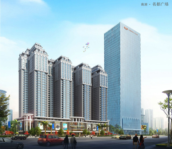 南湖名都廣場是南寧港昌房地產有限公司投資興建的高層建筑綜合體,集住宅、商業(yè)、寫字樓、酒店為一體,總建筑面積約為30.5萬平方米。項目分為兩個部分,其中A座為皇冠假日酒店和高檔寫字樓,其建筑外立面為水波幕墻設計,由數(shù)以千計的雙層中空low-e幕墻純手工拼接而成。水波幕墻具有減少光污染的作用,它利用光漫反射原理裝成,在滿足樓宇采光的同時,極大地降低了光污染,更加環(huán)保從而降低能耗。