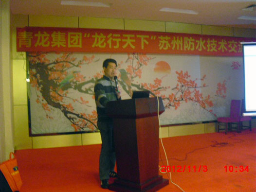 2012年11月3日,龍行天下之青龍建材防水技術(shù)交流會(huì)蘇州站在昆山市華東大酒店舉行。此次技術(shù)交流會(huì)由青龍?zhí)K州分公司承辦,共有60余人參加。