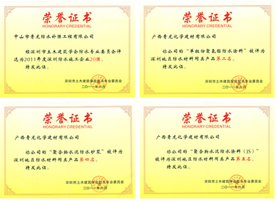 聚合物防水水泥涂料(JS)分別獲得深圳地區(qū)同類產(chǎn)品第二名,第四名和第五名。