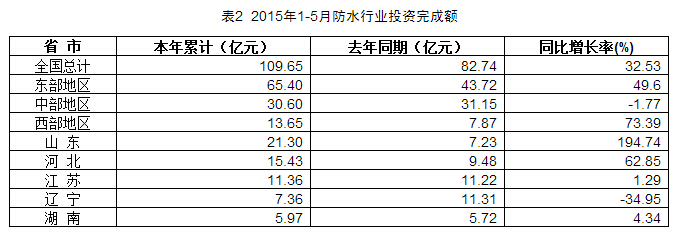 國家統(tǒng)計(jì)局對(duì)主營業(yè)務(wù)收入高于2000萬元企業(yè)進(jìn)行統(tǒng)計(jì),1-5月,防水行業(yè)投資完成額109.65億元,同比增長32.53%。其中,山東地區(qū)的投資完成額為21.30億元,同比增長194.74%。