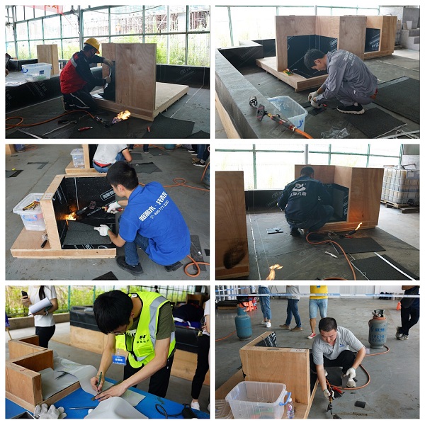 本次比賽,參賽選手同場(chǎng)競(jìng)技改性瀝青防水卷材、高分子防水卷材施工兩大項(xiàng)目,理論考試現(xiàn)場(chǎng),選手們沉著冷靜地完成作答;實(shí)操比賽中,參賽選手嚴(yán)肅認(rèn)真地按照標(biāo)準(zhǔn)化施工模式進(jìn)行了實(shí)際操作和規(guī)范處理。